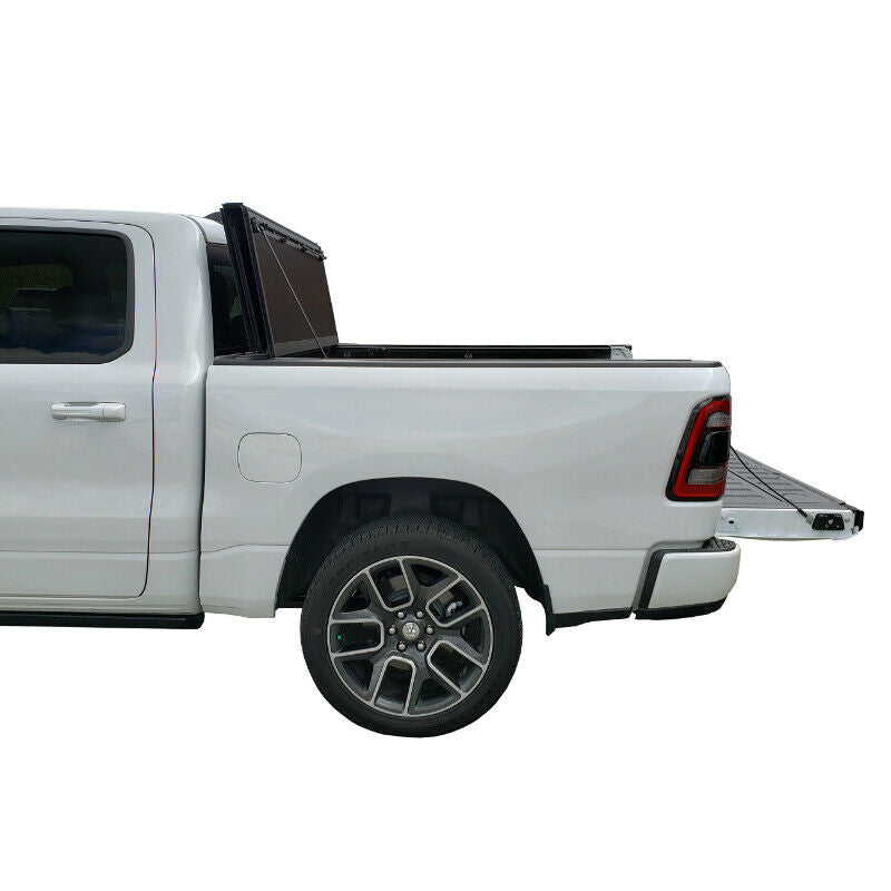- Low Profile Hard Tri-Fold style, mounts flush inside the bed rails and flips up against the back window.