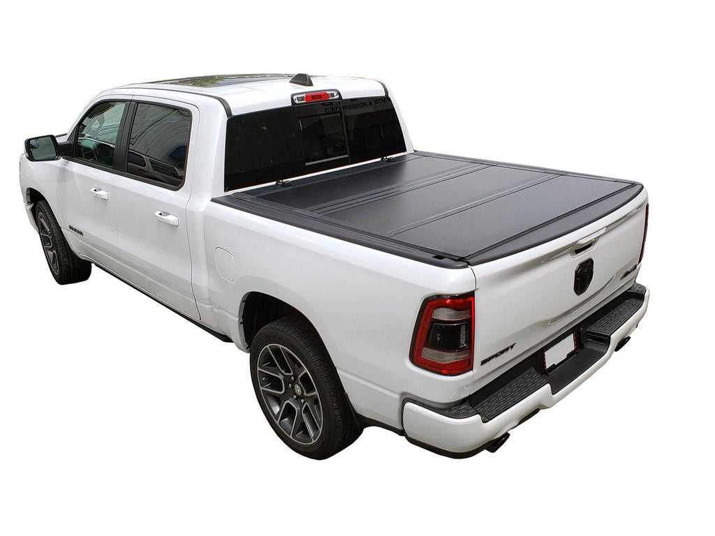 - Low Profile Hard Tri-Fold style, mounts flush inside the bed rails and flips up against the back window.